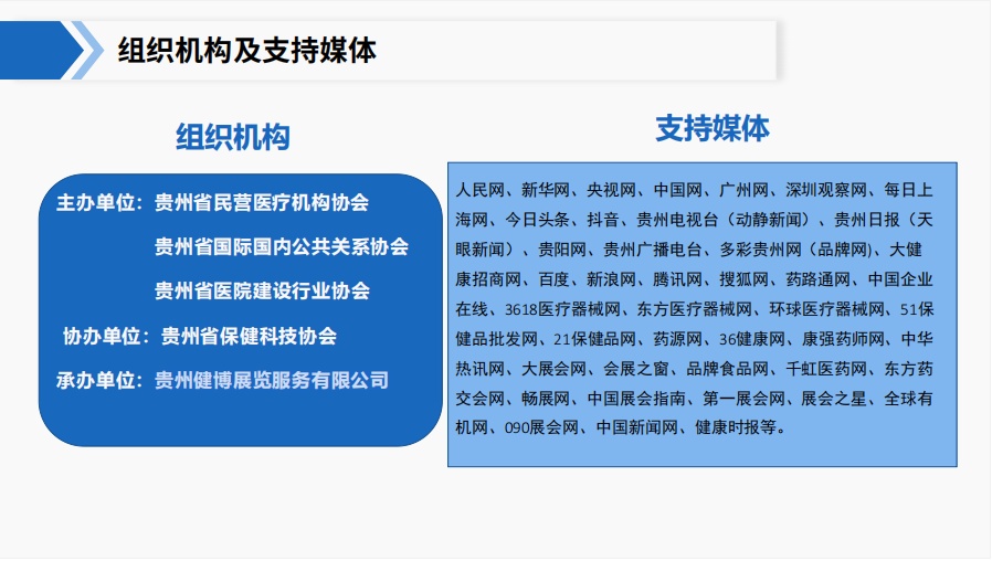 主办单位 | 贵州省民营医疗机构协会 贵州省国际国内公共关系协会 贵州省医院建设行业协会 |