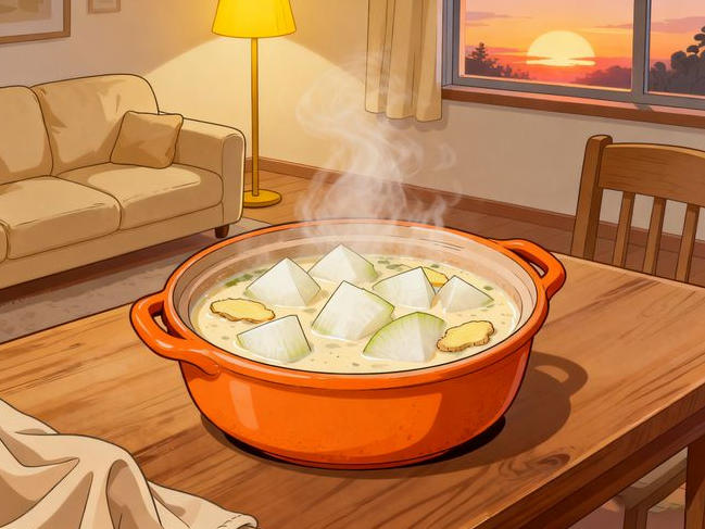 食材:白萝卜1根(去皮切滚刀块)、生姜3片、红枣2颗(去核)、清水800毫升;